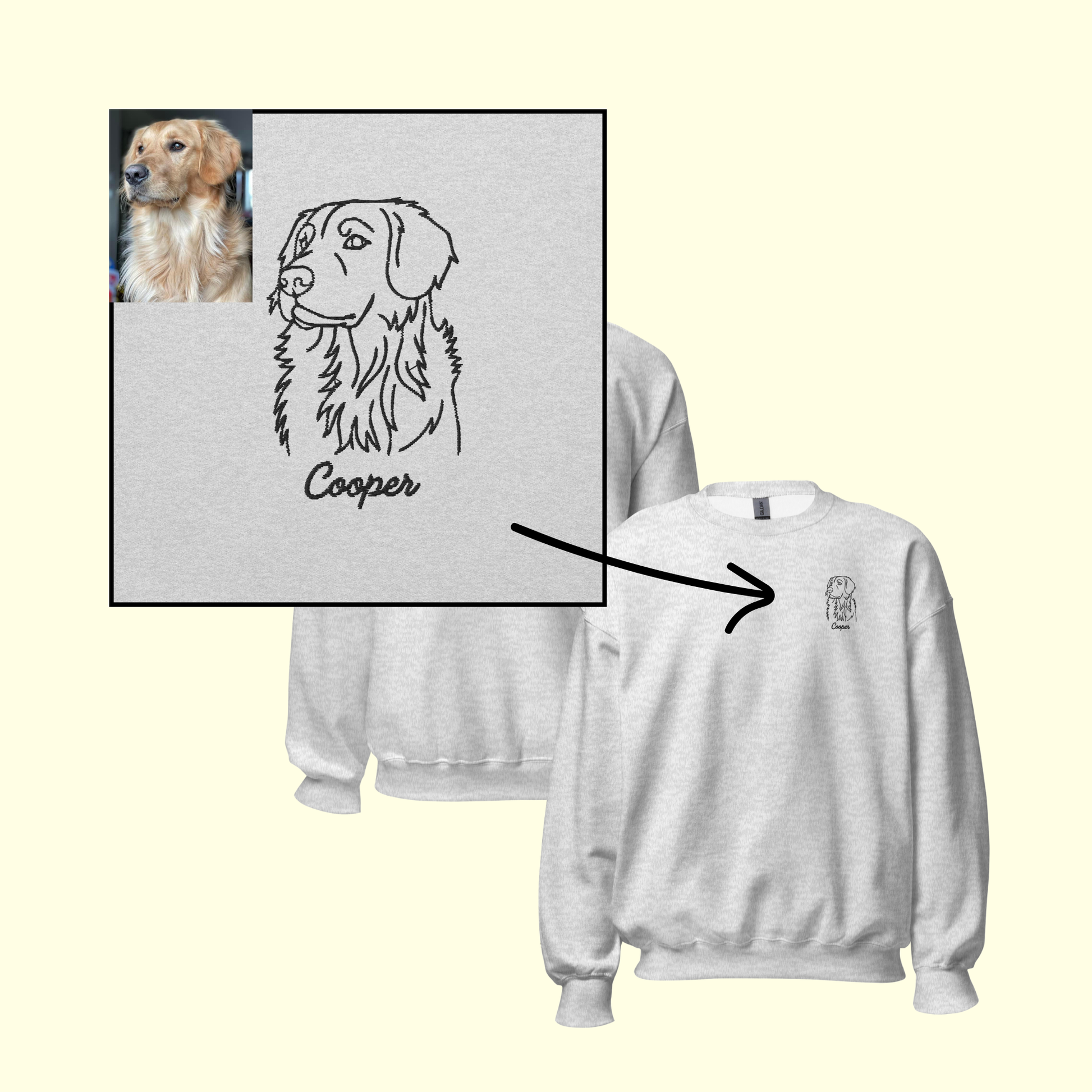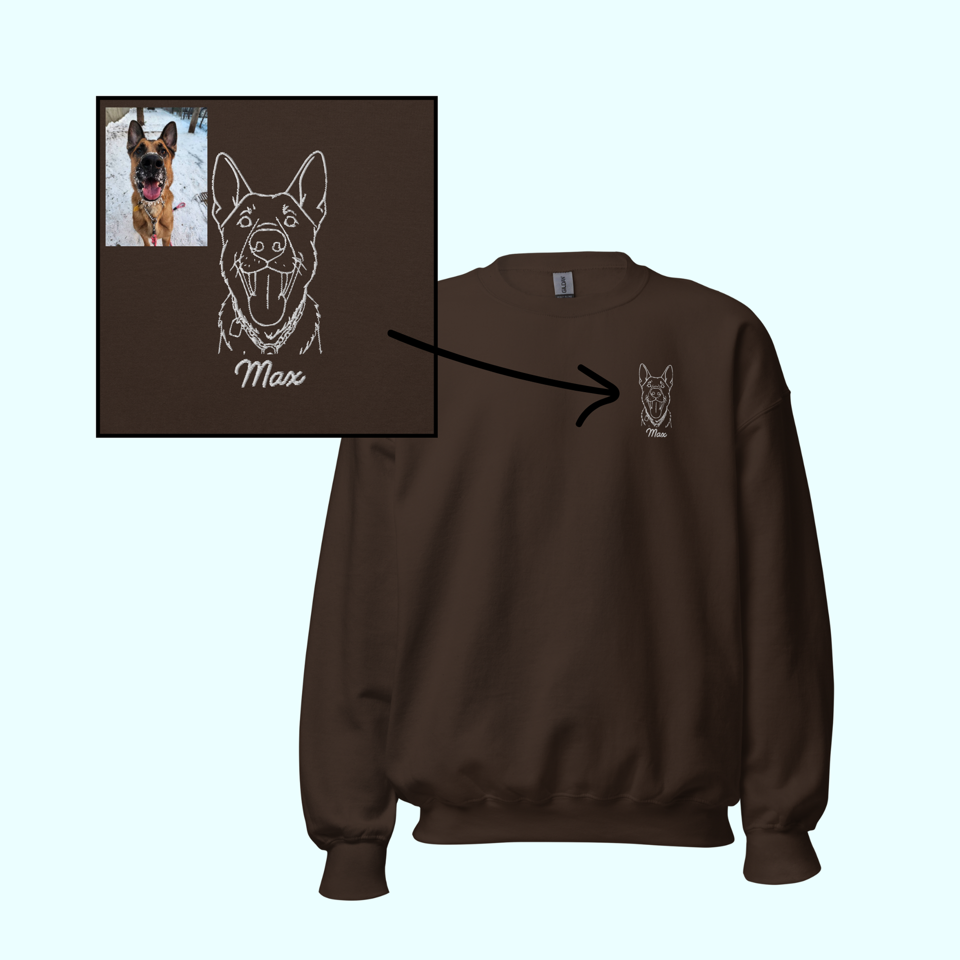 Please include your Dogs Name (and Date of Birth if you're getting the sleeve embroidery) in the text box below and upload your image to the grey box, and I can get started on your custom crewneck!